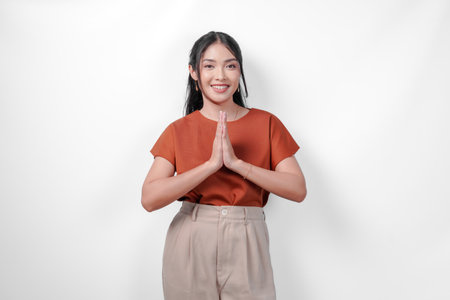 Peaceful young Asian woman in brown shirt gesturing greeting or namaste isolated over white background.