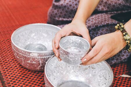 People in traditional ceramony in Songkran festival for pay respect the elderly and holy thing - Songkran festival of northern Thai traditional holiday concept