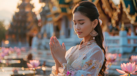 Thai woman in traditional white attire praying at a temple. Serene lady in cultural dress with hands together. Concept of spirituality, tradition, Thai culture, and peaceful meditation