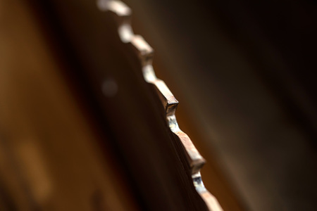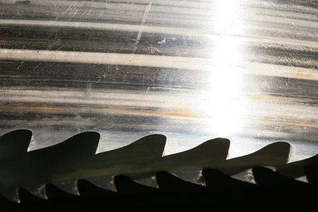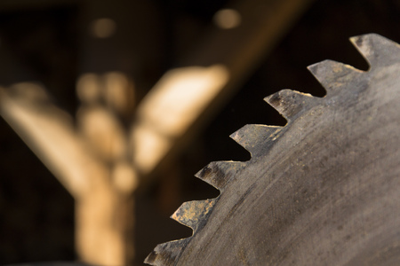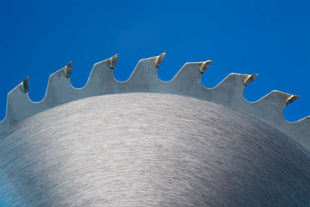 Wood circular saw blade, big teeth steel blades details, blue tint, close up