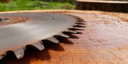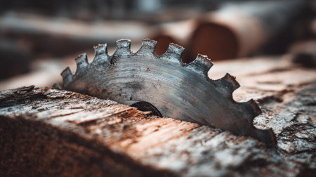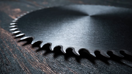 This close-up image features a circular saw blade with sharp teeth resting on a rustic wooden surface, showcasing its metal texture and industrial design for various applications.