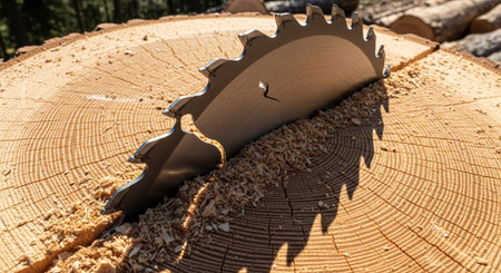 A striking close-up image of a circular saw blade inserted into a wooden log, showcasing detailed teeth and textures, set against a blurred backdrop of lumber.
