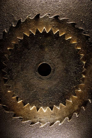 old rusty grunge circular electric saw disk part closeup isolated on white bakcgound.