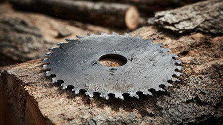 This image captures a detailed view of a circular saw blade on a wooden log, highlighting the intricate design, surfaces, and utility for woodworking projects.