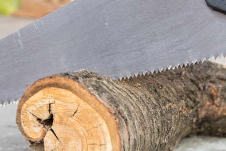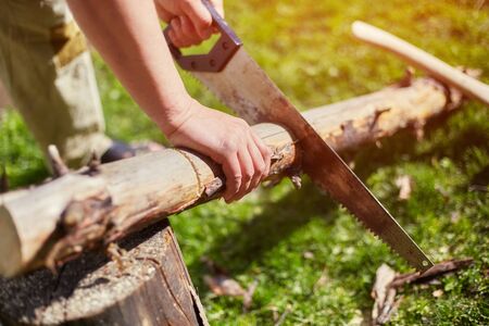 Man cutting a wood tree with a hand saw on green outdoors, closeup.
