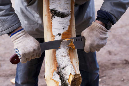Closeup of a birch tree log being sawn by someone dressed in a suit and dress shirt with a hacksaw in color