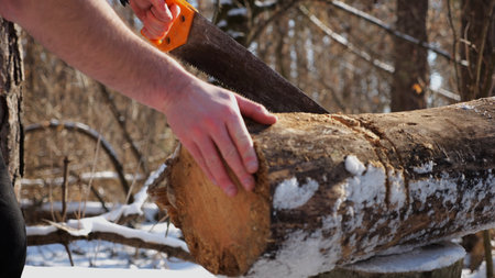 Male arm sawing a log in sunny winter forest. Strong guy working with a saw in snowy woodland. Concept of strength, masculine, energy, and harmony with nature during cold season. Slow motion
