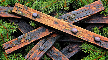 Rustic, reddish-brown sticks crisscrossed over green background. High contrast, detailed texture. Suitable for various design projects.