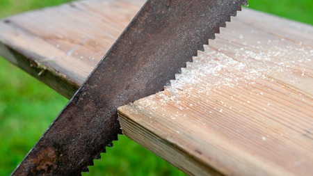 Old rusty hand saw sawing a board. Construction and renovation concept