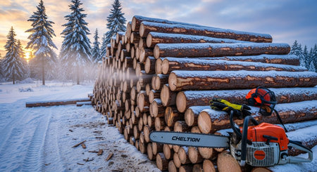 showing chainsaw and safety gear rest on a stack of snow-covered pine logs in a winter forest landscape at...