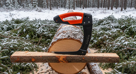 showing forestry tool with orange handle resting on a log in a snowy winter forest with fir trees.