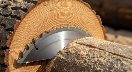 Closeup of sharp steel saw milling blades cutting through thick timber highlighting durable metal teeth and precision wood slicing in industrial woodworking.