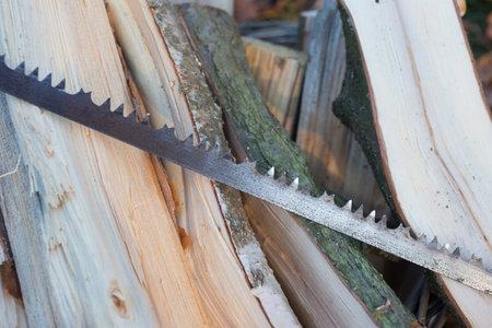A vintage hand saw rests on a pile of firewood, showcasing the rugged texture of wood and tool. This close-up captures the essence of rustic craftsmanship and outdoor life.
