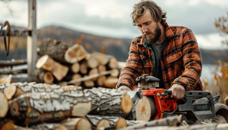 A man is engaged in logging, cutting a log with a chainsaw in the beautiful landscape. The sound of the chainsaw echoes through the sky as a historic event in the art of woodcutting