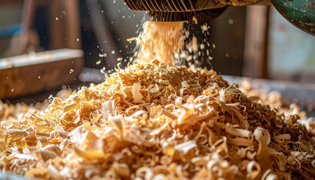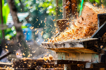 Golden Hour Sawdust A Close-Up, Wood Chips Cascading Through Sunlight During a Woodworking Project