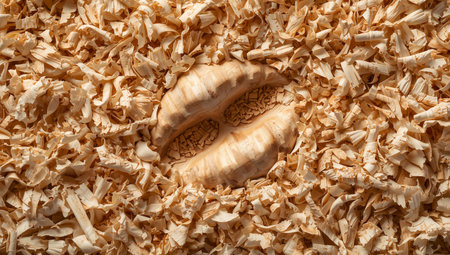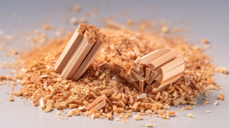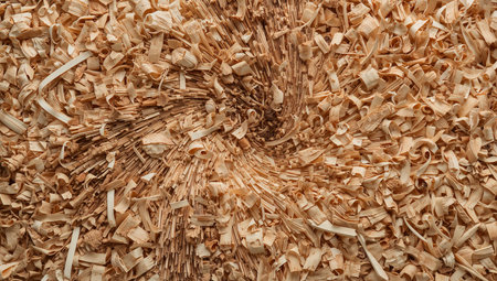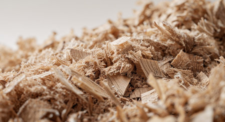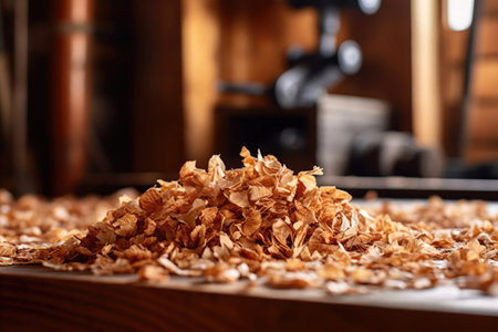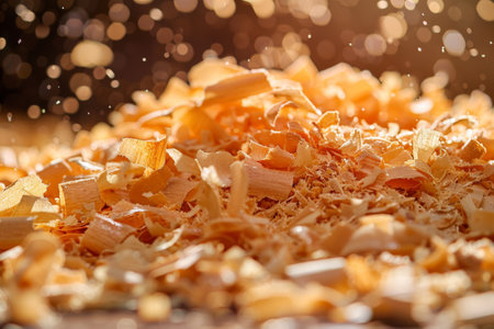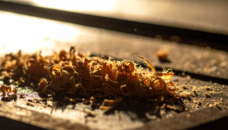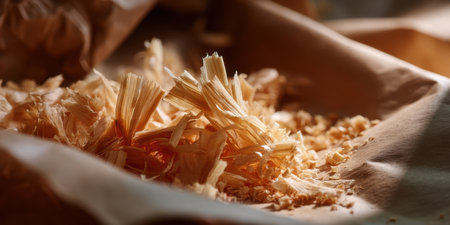 Wood shavings close up with warm natural light creating cozy and rustic atmosphere in soft focus background