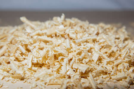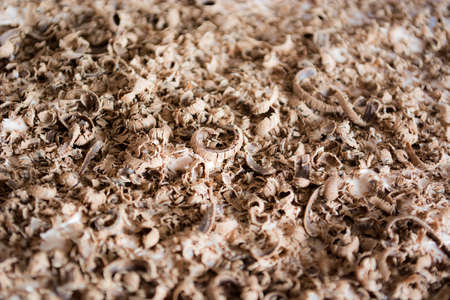 Close-up of wood shavings after woodworking in carpentry shop, background