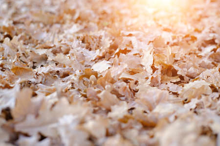 Fallen autumn oak leaves, on a warm day, bright sunlight
