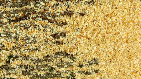 Wooden background with sawdust top view with place for text or inscription. Wood dust texture. Sawdust pattern closeup background pattern.