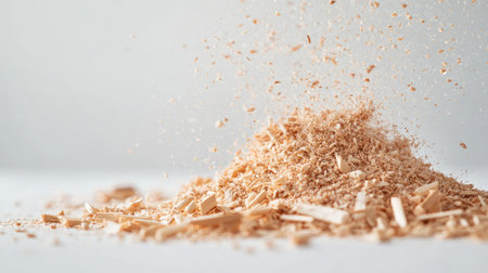Closeup of wood shavings and powder forming a small pile on a pristine white background, showcasing natural tones and textures with copy space