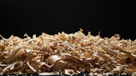 Beautiful spiral curled wooden sawdust in texture detail. Abstract close-up of wood shavings scattered on pile as decorative background. By-product of milling, routing or drilling. Woodworking waste.