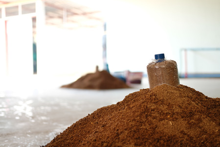 Rice husks use for adsorb water on the floor ground . Selective focus.