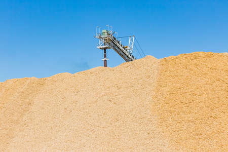 Pile of wood chips at biomass co-generation plant at the foreground in focus with beautiful blue sky in the background out of focus