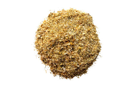 Dried medical chamomile flowers and grass isolated on white background. Heap of dried chamomile herb