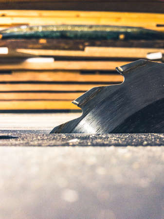 circular power saw for cutting wood. circular saw blade on a wooden machine. preparation of firewood