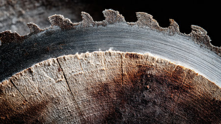 Detailed view of a circular saw blade with sharp teeth and a wooden texture, showing the tools of craftsmanship in woodworking and construction.