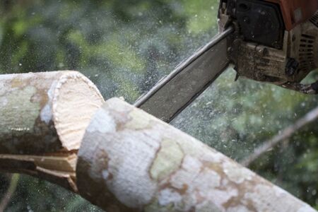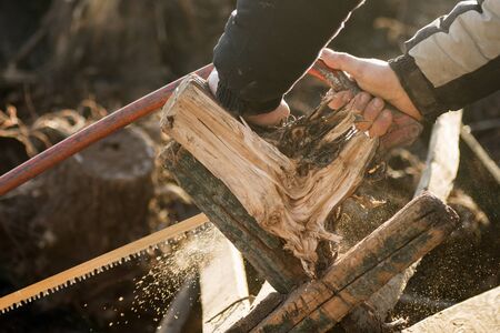 Timber cutting wood with old saw, chainsaw and blade.