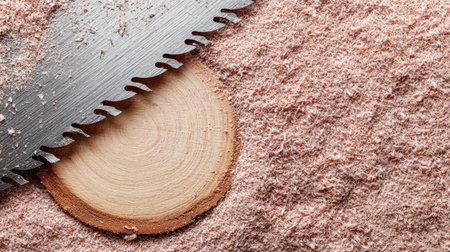 Close-up image of a wood slice and a saw blade resting on a bed of sawdust. The image shows the wood grain detail of the slice and the texture of the sawdust.