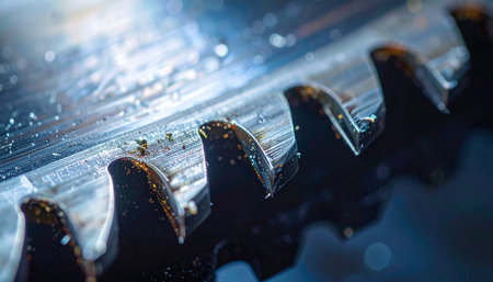A dramatic macro view captures the formidable teeth of a wet industrial saw blade, glistening under a stark light.