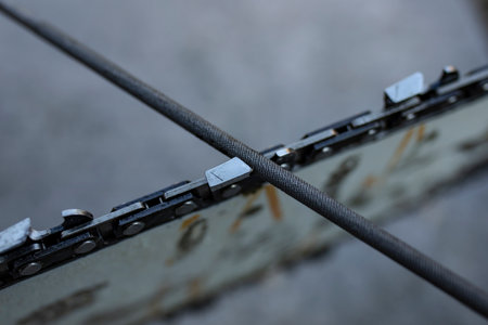 Chainsaw chain sharpening with a special round file, soft focus