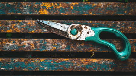A photo of garden shears on wooden slats, rusted and worn with a green rubber handle. --chaos 30 --ar 16:9 --v 6.1 Job ID: dd93356f-2cd7-4d37-8906-26881049ffc9