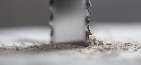 Close up electric jigsaw blade on top of wooden blocks
