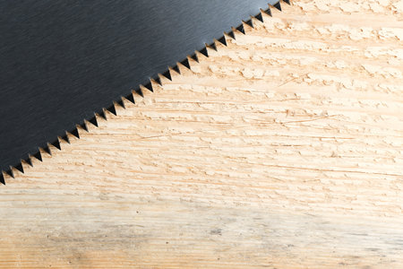 A detailed close-up image of a vintage hand saw resting on a rustic wooden surface, showcasing the tool's blade and texture with soft shadows and light.