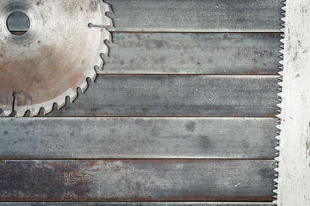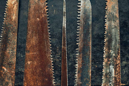 Saws on metal surface. Rusty tools for maintenance. Hardware to fix. Technical background with copy space