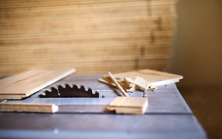Carpenter tools on wooden table with sawdust. Circular Saw.