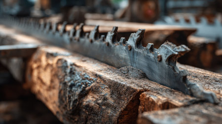 Closeup of sharp steel saw milling blades cutting through thick timber highlighting durable metal teeth and precision wood slicing in industrial woodworking.