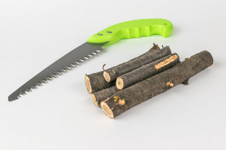 Green Hand Saw with Sharp Blade Next to Cut Tree Branches on White Background
