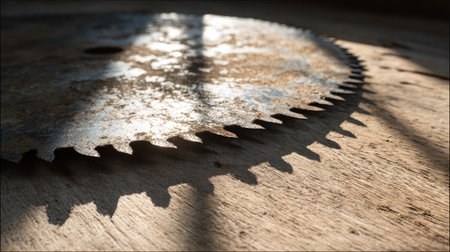 A close-up image of a rusty circular saw blade, showcasing intricate details and textures. The soft light enhances shadows, creating a vintage industrial atmosphere.