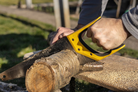 Man cutting a wood tree with a hand saw on green outdoors, closeup.