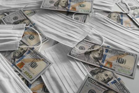 Medical face masks and 100 dollars banknotes. American money. COVID-19 coronavirus in USA. Expensive medical assistance, financial crisis concept