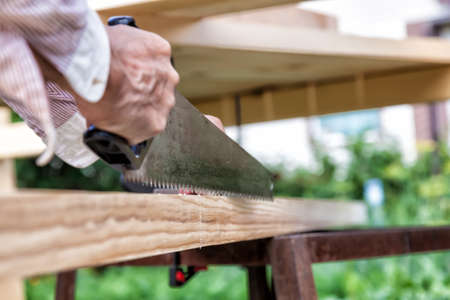 close up of Carpenter sawing a board with a hand wood saw. flying sawdust from wood. repair work