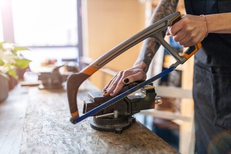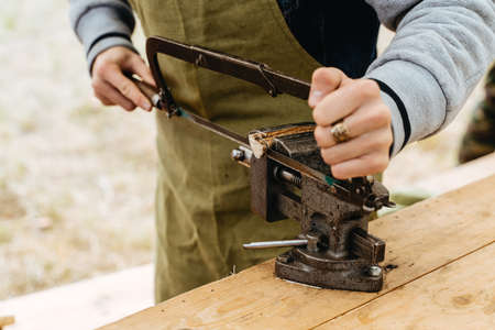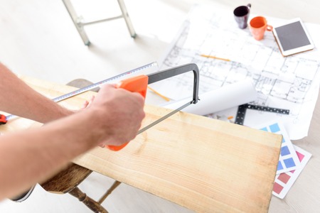 It will not be difficult. Close up of man holding saw in his hand and sawing wooden board