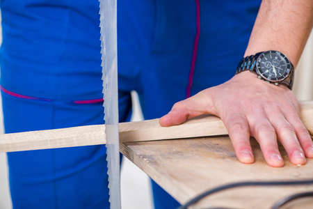 A male carpenter is sawing a chipboard. DIY construction work and home renovation