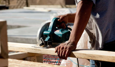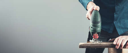 A carpenter uses an electric jigsaw to cut the wood on the table. out of focus background.