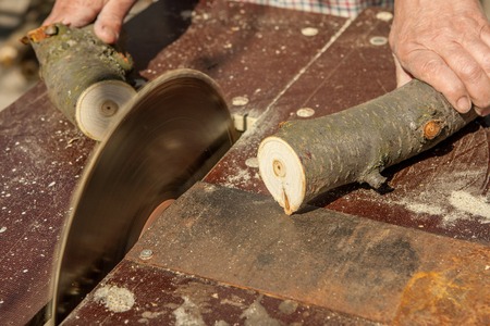 Carpenter using Electric Wood Cutter making wooden furniture in DIY workshop.