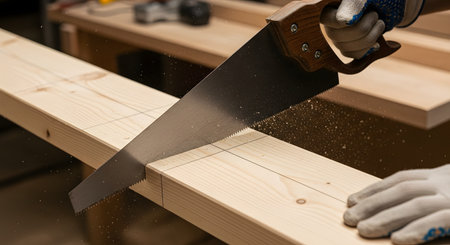 Close-up of a carpenter's gloved hands using a traditional hand saw to cut through a pine wooden plank. Sawdust flies in the air as the blade works through the timber in a workshop setting. The image captures the physical effort and precision of manual woodworking and construction.